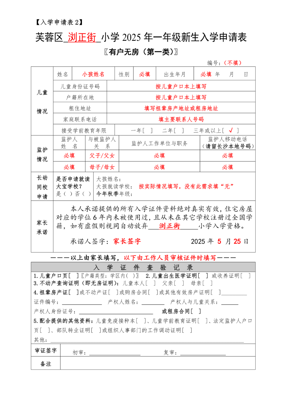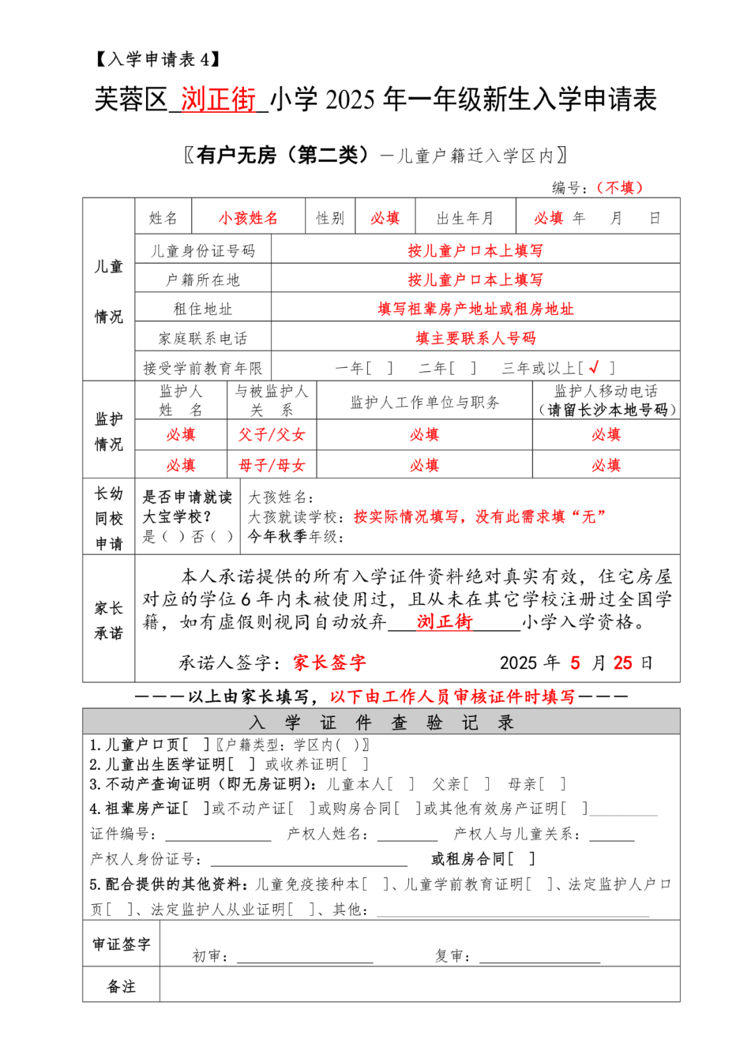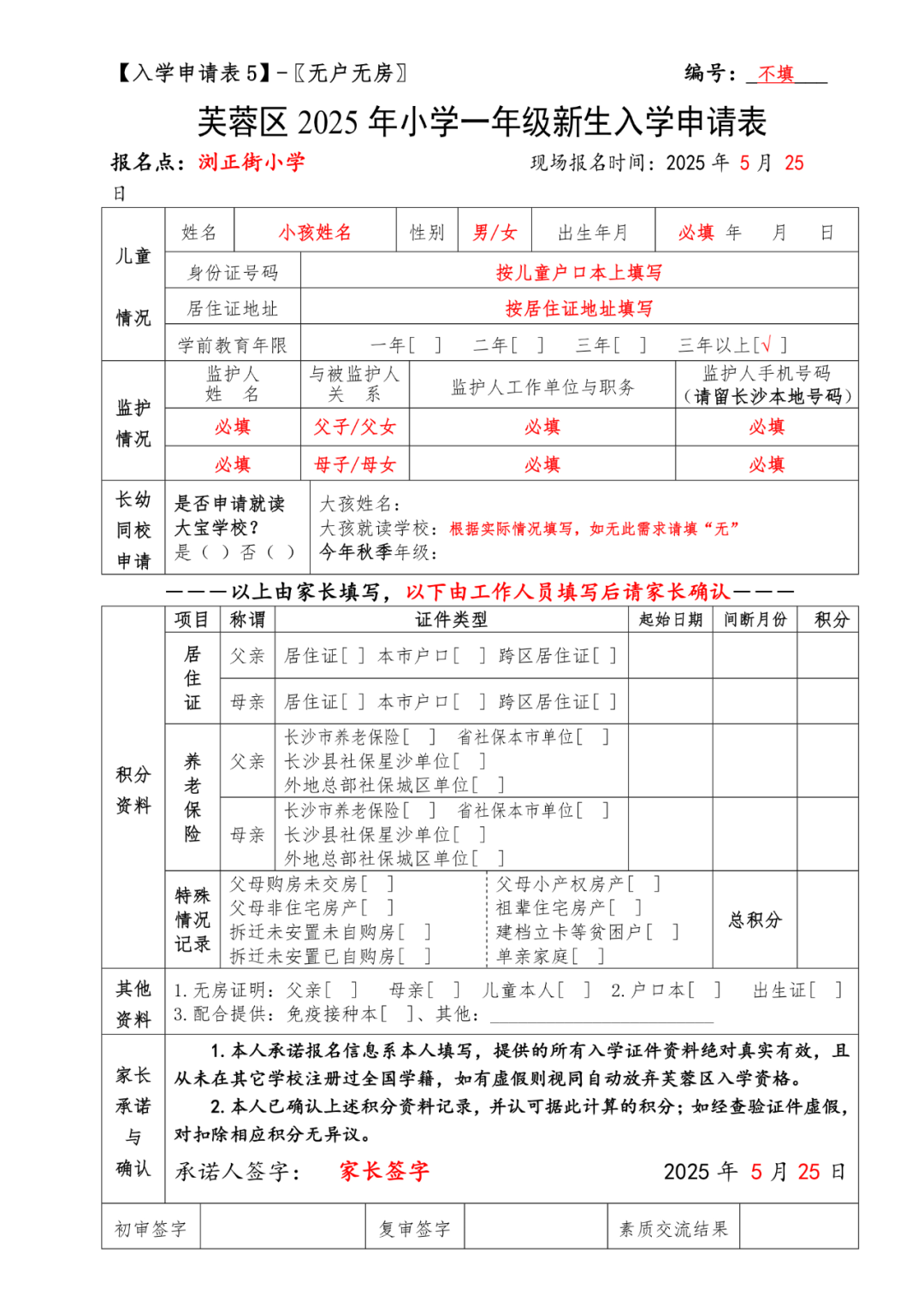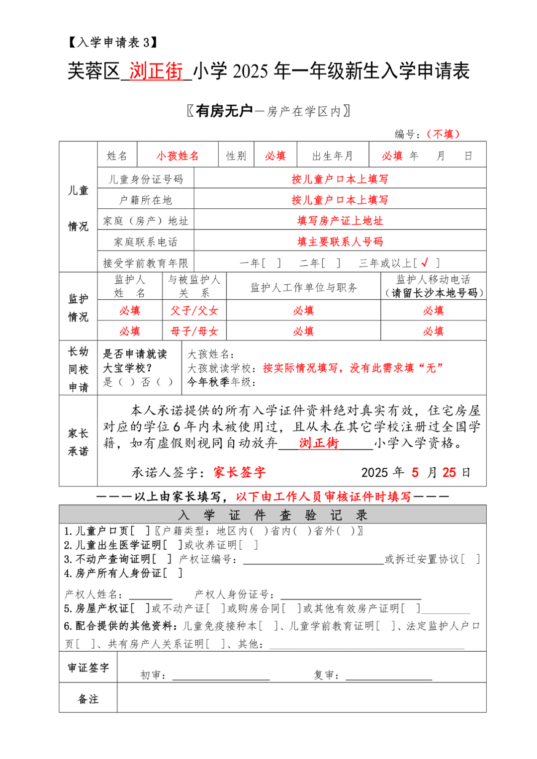 2025年芙蓉区小学新生入学报名表样表