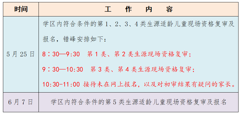 2. 由于报名人数较多,为避免拥堵与过长等待时间,请家长严格按照学校错峰时间段到校有序报名,不要焦虑,更不要提早排队,学校将根据“房户一致”优先的原则按生源类型排序录取,与家长排队先后顺序无关。