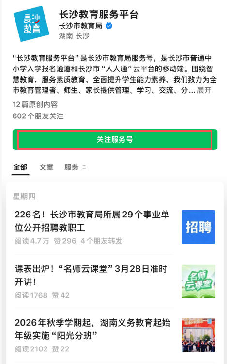 1. 关注公众号微信搜索并关注“长沙教育服务平台”公众号,入学前请勿解除公众号关注,以免错过学校相关通知。